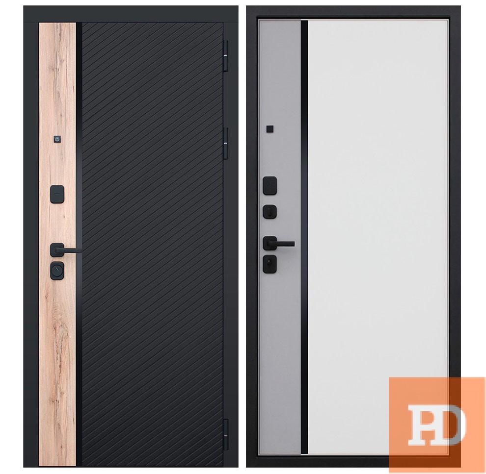 | Внешняя отделка | Наружный лист металла 1,5 мм. Панель МДФ 10 мм. Объемная фрезеровка. Цветовая комбинация: “дуб галиф натур”, “шагрень черная”. Декоративная пластиковая вставка, цвет "черный". Наличник МДФ 80 мм., цвет “шагрень черная”. |