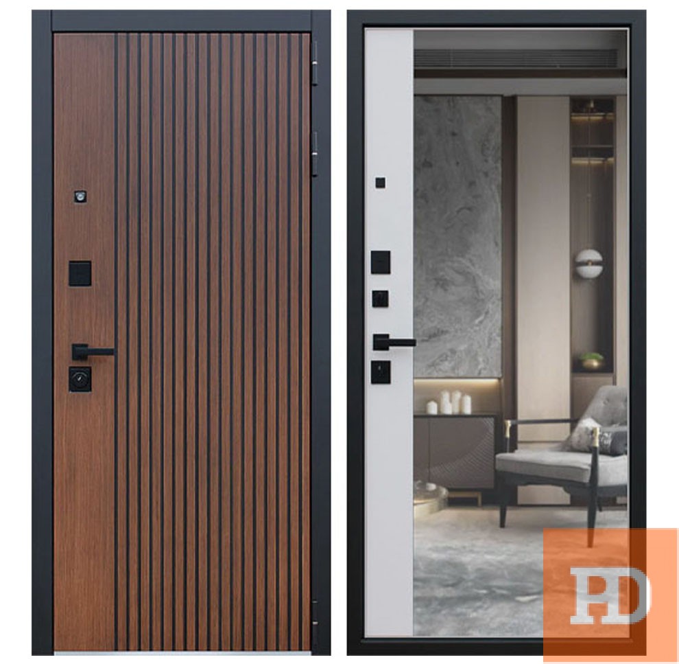| Внешняя отделка | Лист металла 1,5 мм. Экошпонированная дизайнерская панель МДФ 10 мм. Линейная фрезеровка. Цветовая комбинация: "дуб кантри темный", черное патинирование по фрезеровке. Наличник МДФ гладкий 80 мм., цвет "черный кварц". |