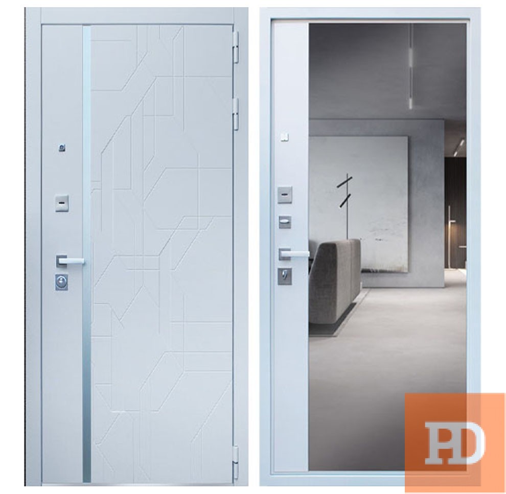 | Внешняя отделка | Лист металла 1,5 мм. Экошпонированная панель МДФ 10 мм (дизайн ФЛС). Цвет "белый матовый". Вертикальная вставка из белого матового лакобеля. Объемная фрезеровка. Наличник МДФ 80 мм. |