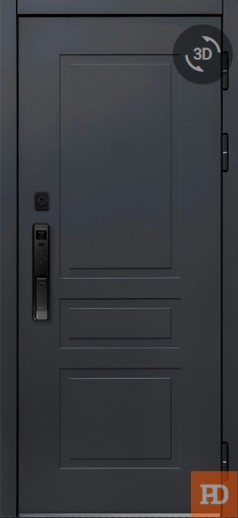 - ОТДЕЛКА СНАРУЖИ: Лист стали, окрашен порошково полимерной краской, цвет "Муар черный", декоративная МДФ-панель 10 мм, цвет - "Шагрень графит"