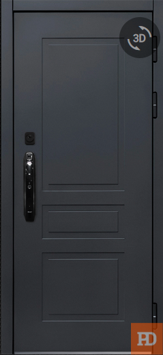 - ОТДЕЛКА СНАРУЖИ: Лист стали, окрашен порошково полимерной краской, цвет "Муар черный", декоративная МДФ-панель 10 мм, цвет - "Шагрень графит"