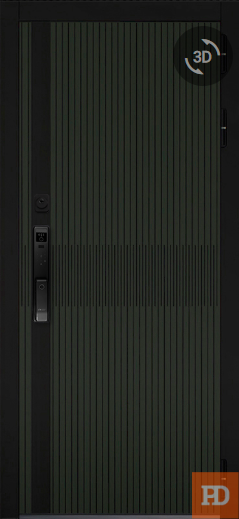 - ОТДЕЛКА СНАРУЖИ: Лист стали, окрашен порошково полимерной краской, цвет "Муар черный", декоративная МДФ-панель 10 мм, цвет - "Черный кварц" + "Олива софт"