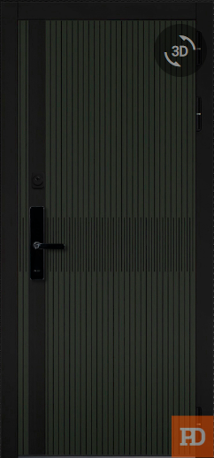 - ОТДЕЛКА СНАРУЖИ: Лист стали, окрашен порошково полимерной краской, цвет "Муар черный", декоративная МДФ-панель 10 мм, цвет - "Черный кварц" + "Олива софт"