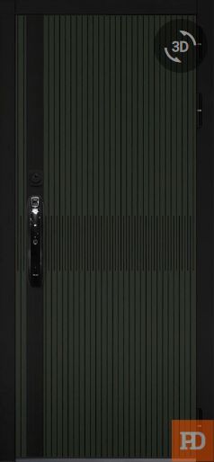 • ОТДЕЛКА СНАРУЖИ: Лист стали, окрашен порошково полимерной краской, цвет "Муар черный", декоративная МДФ-панель 10 мм, цвет - "Черный кварц" + "Олива софт"