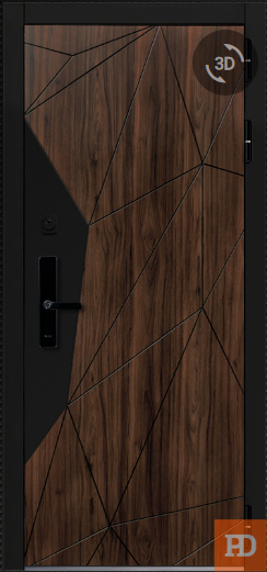 - ОТДЕЛКА СНАРУЖИ: Лист стали, окрашен порошково полимерной краской, цвет "Муар черный", декоративная МДФ-панель 10 мм, цвет - "Черный кварц" + "Орех каньон"