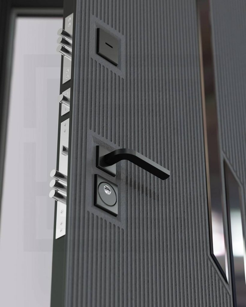 | Полный комплект | Фурнитура в черном цвете: Броненакладка врезная, накладка со шторкой, глазок , дверная ручка, ночная задвижка. Цилиндр ключ-вертушка (производитель не регламентируется), регулируемый эксцентрик. |