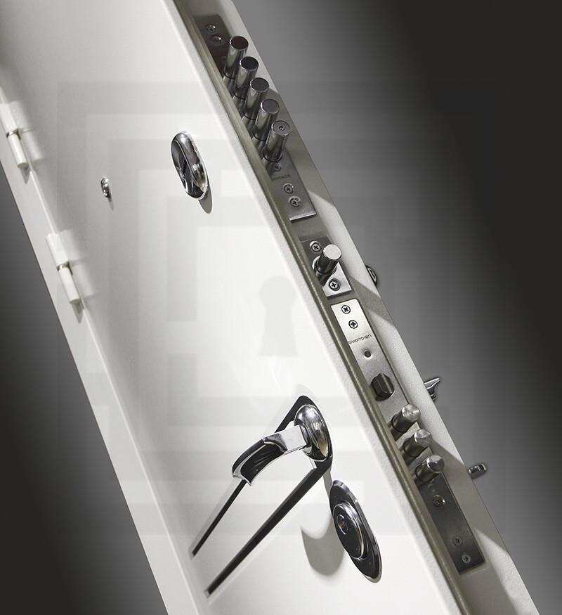 Полный комплект Броненакладка врезная, накладка шторка-автомат, глазок , дверная ручка, ночная задвижка, цилиндр ключ-вертушка (производитель не регламентируется), регулируемый эксцентрик.