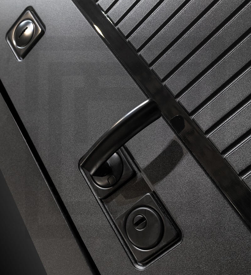 | Полный комплект | Фурнитура в черном цвете: Броненакладка врезная, накладка со шторкой, глазок , дверная ручка, ночная задвижка. Цилиндр ключ-вертушка (производитель не регламентируется), регулируемый эксцентрик. |
