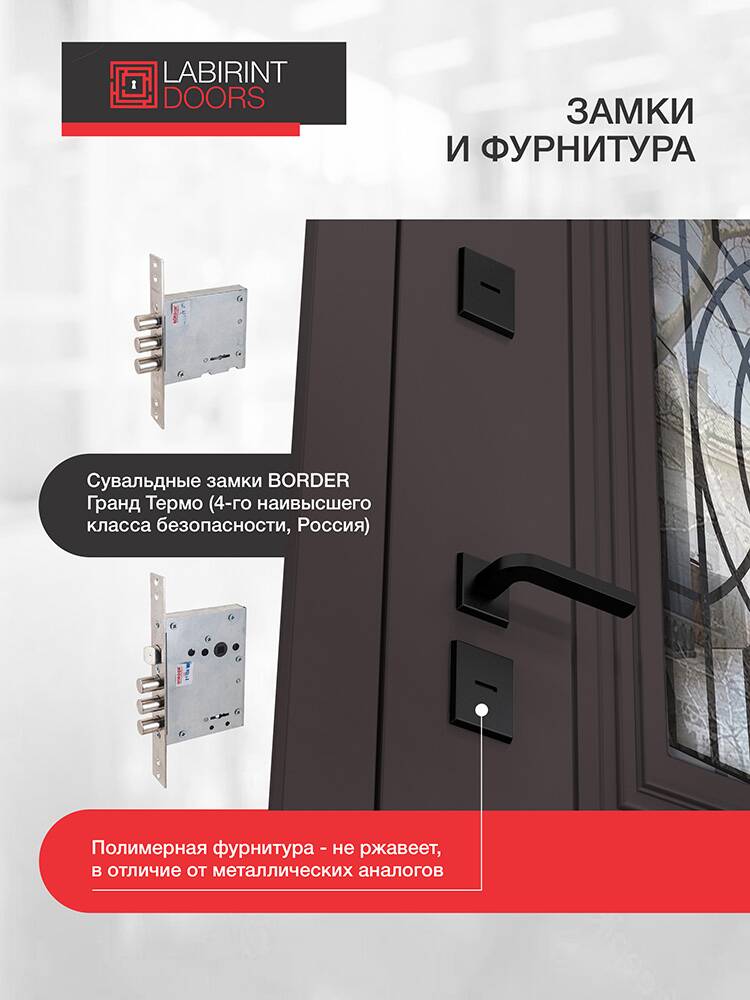 | Стеклопакет | 3-х камерный стеклопакет 81 мм, снаружи тонированное стекло графит, внутри зеркальное серебро. Лазерная решетка внутри стеклопакета (муар черный) |