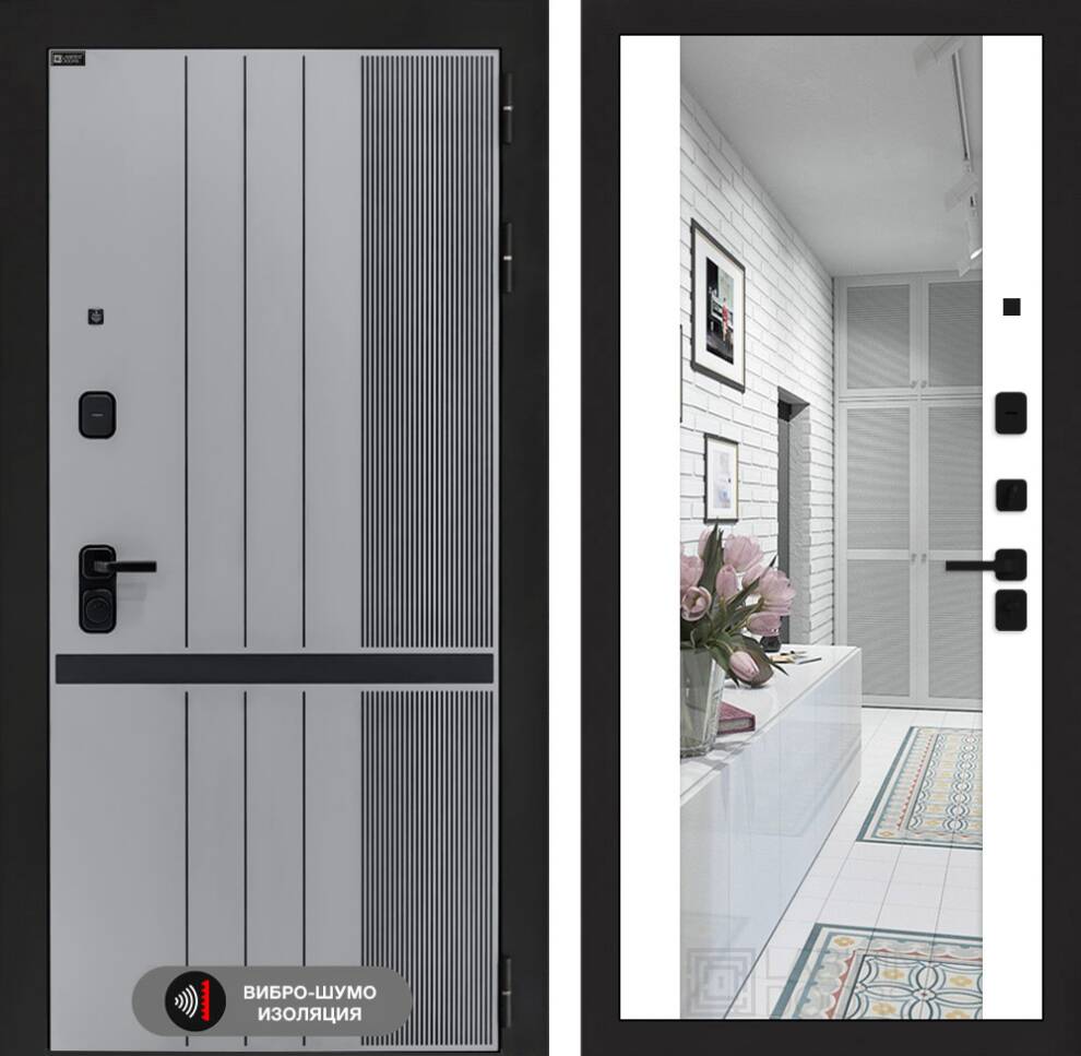 | Отделка снаружи | Фрезерованная МДФ панель 10 мм, цвет "Веллюто Гриджио" с патиной и вставкой из металла в цвет наличника |